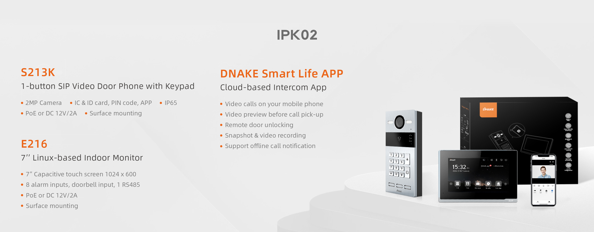 มีรุ่นให้เลือกมากมาย (ไอพีเค02, IPK03, IPK04และฉันพีเค05DNAKE จึงมั่นใจได้ว่ามีตัวเลือกที่ตอบโจทย์ทุกความต้องการ ไม่ว่าจะเป็นระบบแบบใช้สายที่เสถียร หรือโซลูชันไร้สายที่ยืดหยุ่น