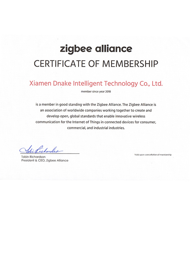 झिग्बी अलायन्सचे सदस्यत्व प्रमाणपत्र -
