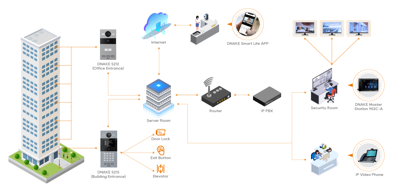 The integration of an advanced IP video intercom system, like DNAKE’s, with the building’s IP phone network offers a seamless communication and access control experience. This powerful combination works through a dedicated app, SIP (Session Initiation Protocol), or a cloud-based service, connecting the video door phone directly to designated IP phones.
