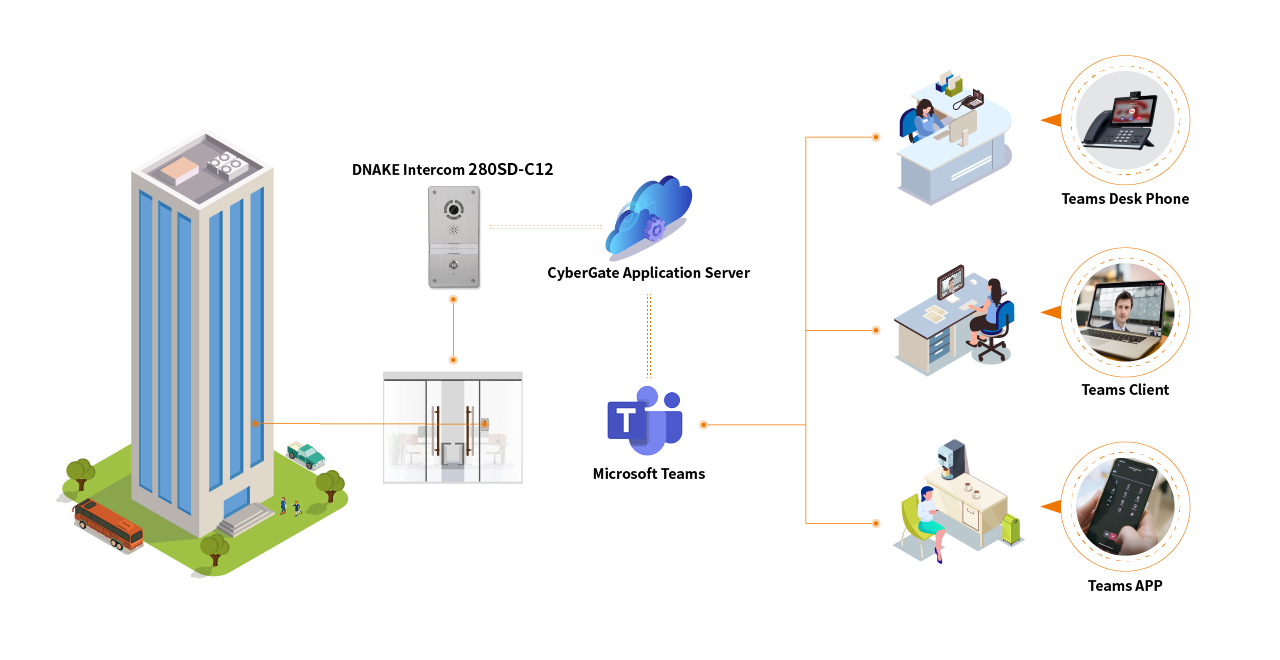 DNAKE (www.dnake-global.com), a leading provider dedicated to offering video intercom products and smart community solutions, together with CyberGate (www.cybertwice.com/cybergate), a subscription-based Software-as-a-Service (SaaS) application hosted in Azure that is Microsoft Co-sell Ready and earned the Microsoft Preferred Solution Badge, are joined to offer Enterprises with a solution for connecting a DNAKE SIP video door intercom to Microsoft Teams.