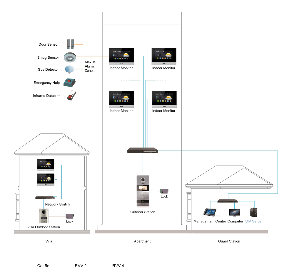 The system is compatible with any device that supports SIP protocol, such as IP phone, SIP softphone or VoIP Phone. By combining with home automation, lift control and 3rd-party IP camera, the system makes a secure and smart life for you.