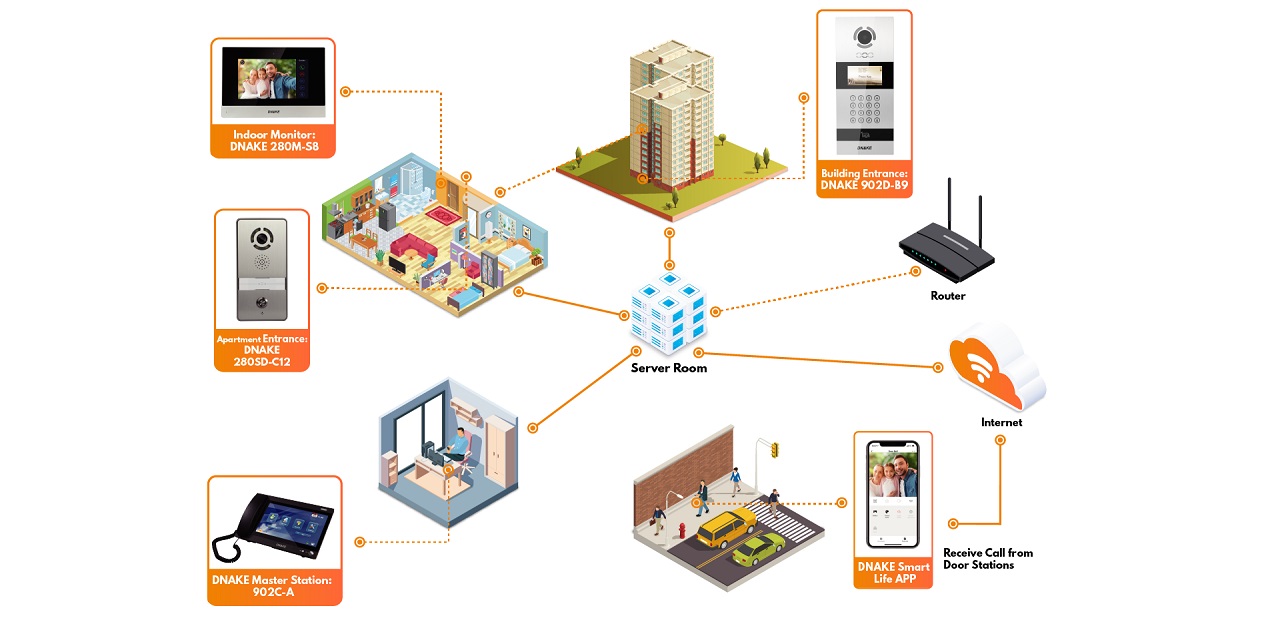 Control the building's entry and regulate access with easy efficient communication. Integrate video surveillance, property management systems and others, DNAKE residential solution allows you to make a secure and smart life.